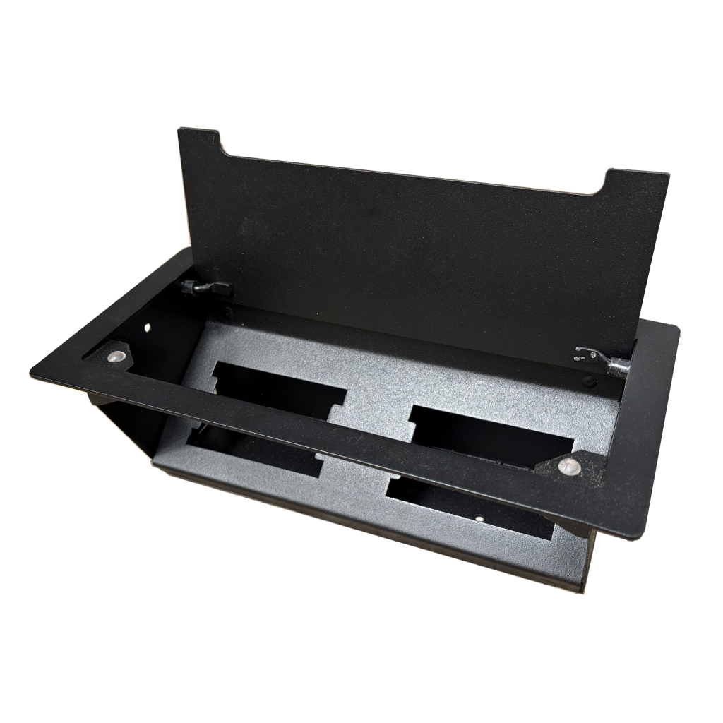 Caja eléctrica doble metálica para embutir en escritorios y mesas de trabajo, con capacidad para 2 módulos de enchufe, tapa abatible y perforaciones laterales para orden de cables. Fabricada en acero de 2 mm, con conexión a tierra y diseño robusto para uso intensivo en oficinas y estaciones de trabajo.
